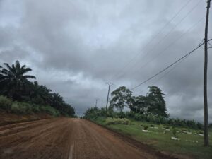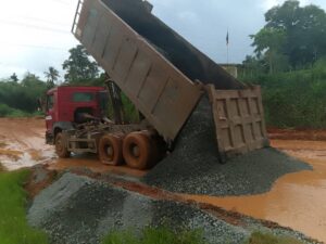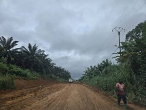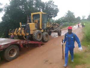 Les activités menées au 8 juillet 2025 concernent le maintien de la circulation au point kilométrique 1+50, avec notamment le réglage de la plateforme à la niveleuse, la mise en œuvre du concassées pour boucher le bourbier identifié et le réglage à la niveleuse pour faciliter la circulation, en dépit des pluies incessantes. Au sujet des activités préalables aux travaux de bitumage, on compte aussi bien la suite des prélèvements de la plateforme par l’équipe géotechnique jusqu’au point kilométrique 2+450, la matérialisation des points kilométriques par l’équipe topographique. Le matériel mobilisé par l’entreprise sur le site est constitué d’une niveleuse, d’un bulldozer, un compacteur à rouleau lisse, une pelle excavatrice, deux camions et deux pick-up. Le personnel se mobilise progressivement et parmi, le conducteur des travaux, le chef chantier, le chef d’équipe terrassement, le chef d’équipe topo et quatre assistants topographes, le chef d’équipe géotechnique et cinq laborantins, les chauffeurs des engins, des gardiens et manœuvres.