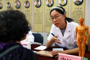 Au milieu de la brise fraîche de la nuit à Baiyin, une ville nichée dans la province du Gansu, dans le nord-ouest de la Chine, le parfum d’herbes comme l’astragale et l’angélique imprègne l’air alors que les foules se rassemblent sous des boîtes lumineuses brillantes autour des stations de ventouses et des cabines de lecture du pouls.